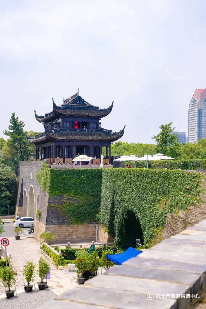 登上阊门城墙,苏州“双面绣”的城市气质一览无余。向西望去,七里山塘的古桥流水尽收眼底,远处的虎丘塔悠然耸立;往东南眺望,现代地标东方之门与古朴的北寺塔形成鲜明对比,绘就一幅古今辉映的江南图景。