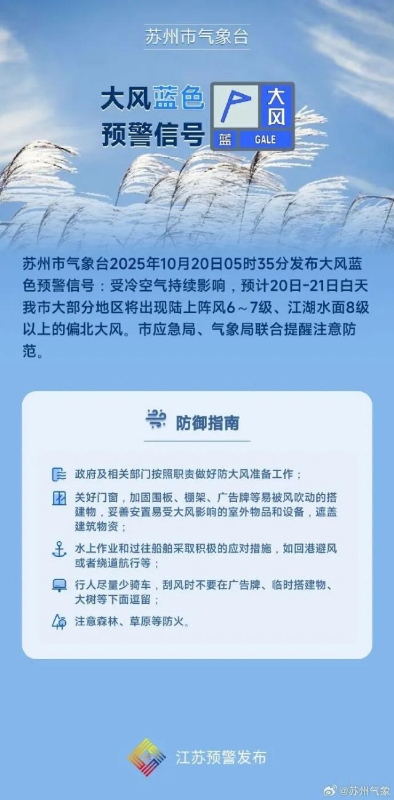 苏州市气象台2025年10月20日05时35分发布大风蓝色预警信号:受冷空气持续影响,预计20日-21日白天,我市大部分地区将出现陆上阵风6~7级、,江湖水面8级以上的偏北大风,市应急局、气象局联合提醒注意防范。