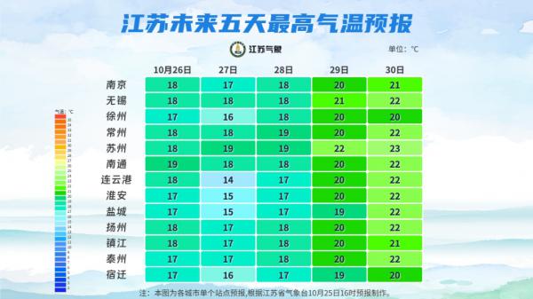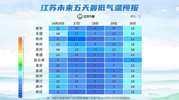 今起(10月26日-28日),江苏以多云天气为主,今晨西北部地区局部有雾或浓雾,27日-28日大部分城市,最低气温将陆续下降至个位数,提醒大家注意保暖。