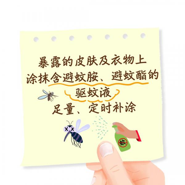 在裸露的皮肤上涂抹含有效驱蚊成分(如避蚊胺、派卡瑞丁、驱蚊酯等)的驱蚊剂,并按说明书要求及时补涂。