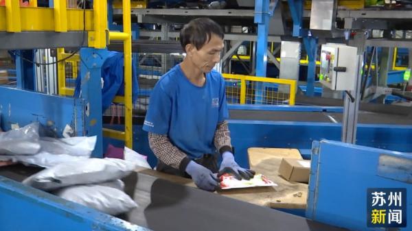在常熟一家快递企业转运中心,自动分拣流水线上各种快件正按照送达地点被分拣到不同的收纳袋,之后被装上发往不同城市的货车。