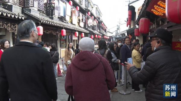 昨天上午,在葑门横街一家专卖爆鱼的网红店门口,等待购买的市民排起长队,队伍从桥头绵延至对岸。