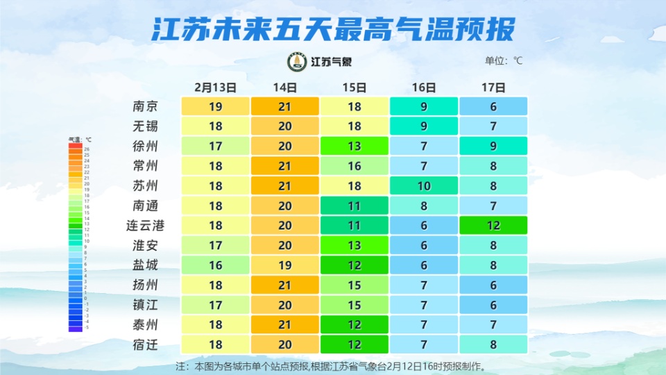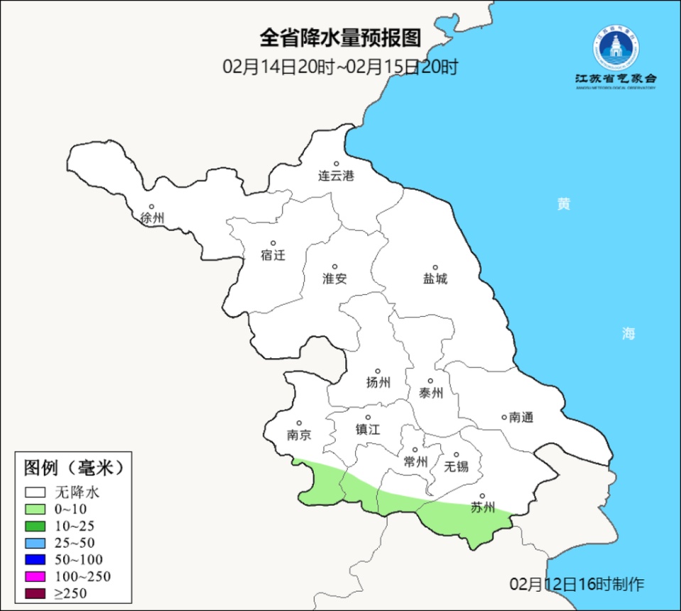 预计当前至春节假期(2月13日至23日),我省以晴好天气为主,期间有一次小雨(14日夜里至16日白天)和两次冷空气(15日前后、22日前后)影响,气温起伏大,无严重冰冻。15日和22日陆上最大阵风7级左右、海区8~9级。14日夜里至15日早晨,盐城、淮安、扬州、泰州、南通及盐城和南通海区有大雾或浓雾。降雨、大雾和大风天气恰逢春节出行高峰,请注意出行安全。