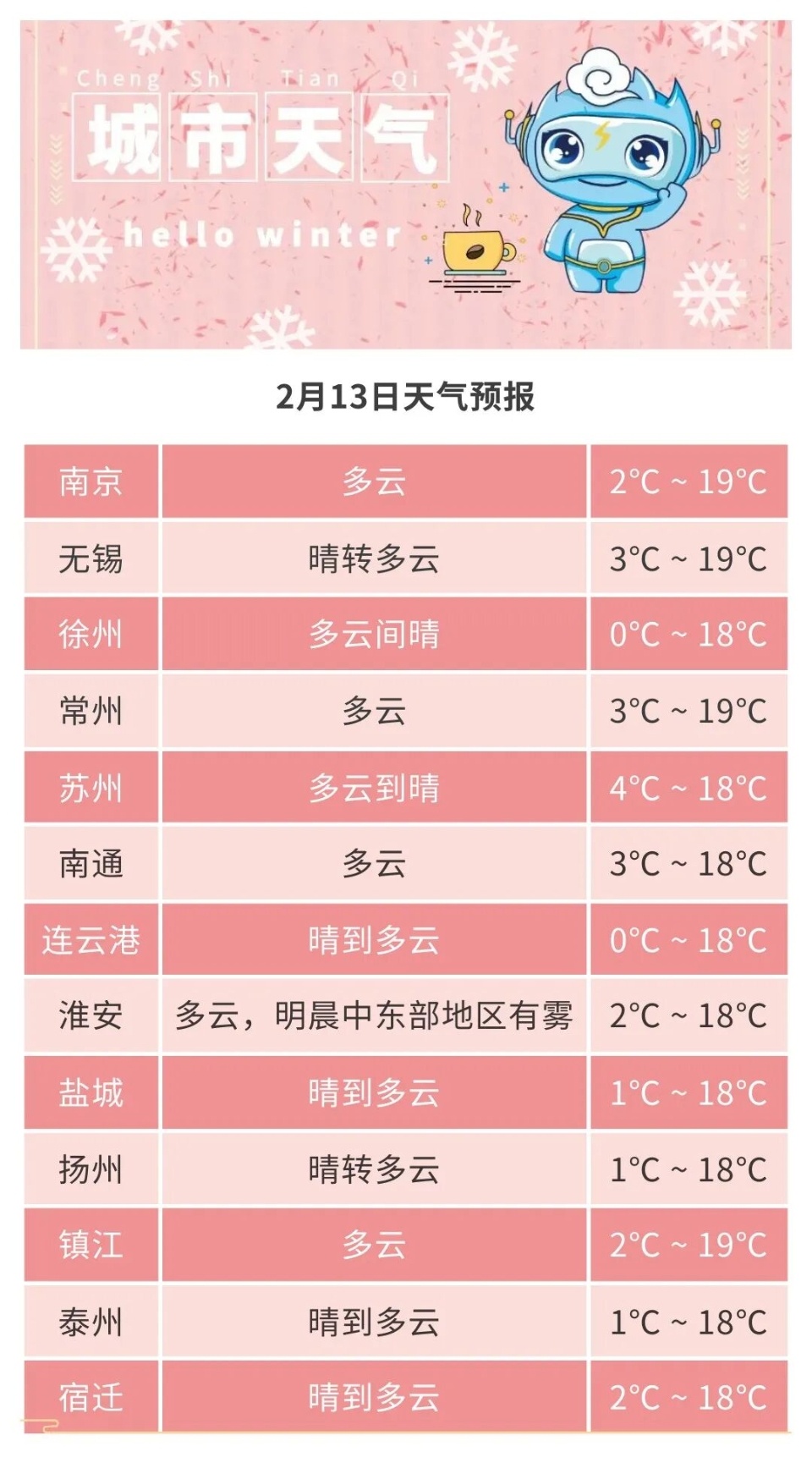 全省晴到多云。最高温度:全省18~19℃;最低温度:沿江和苏南地区2~3℃,其他地区1℃左右。全省偏南风3-4级。