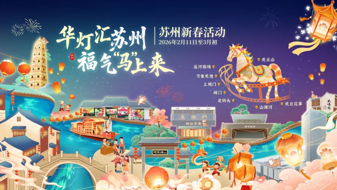 “华灯汇苏州 福气‘马’上来”苏州新春活动持续至3月初,在虎丘山风景名胜区、虎丘花事等景区将给大家带来演出、巡游、市集活动。快来抓住新年的尾巴,再来一次灯彩里的相逢吧。