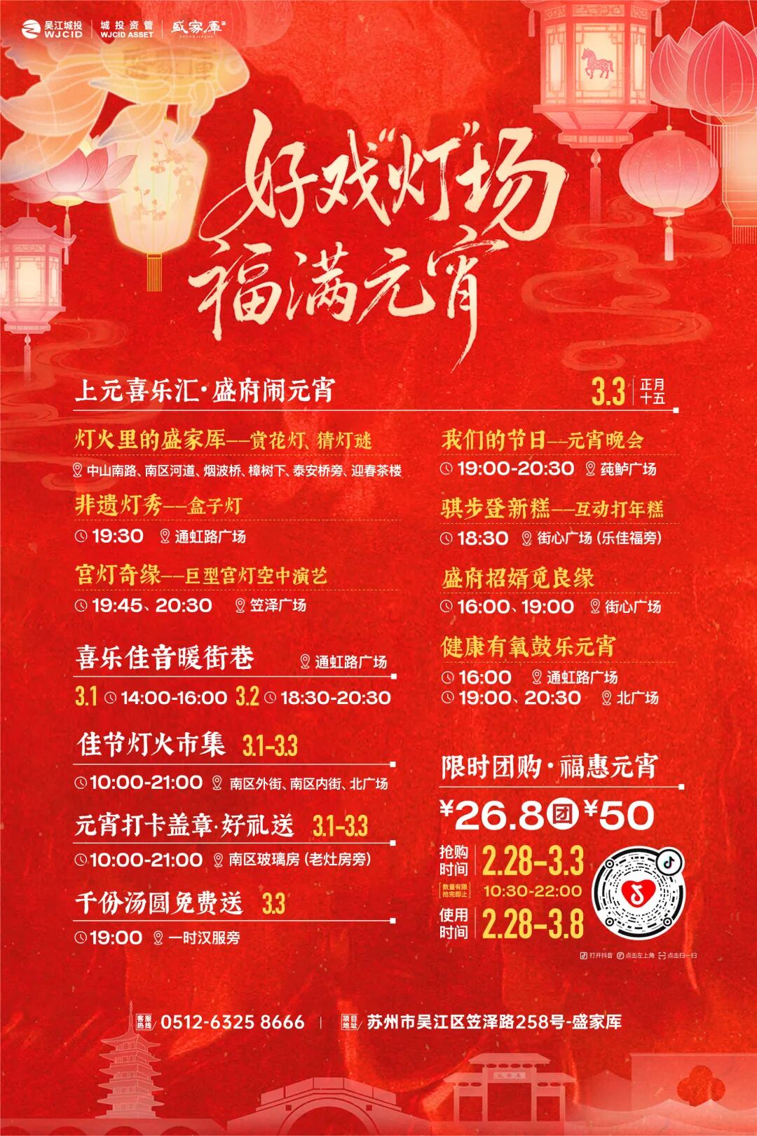 “好戏‘灯’场 福满元宵”2026盛家厍元宵节系列活动将于3月1日至3日在吴江盛家厍正式举办。本次元宵活动为期三天,集民俗展演、非遗展示、美食体验、互动打卡、消费惠民于一体,兼顾传统韵味与潮流好物。3月1日,元宵盛会正式启幕,80个特色展位集中亮相,汇聚非遗文创、特色美食、创意手作等品类,苏式糕点、网红轻食、传统小吃等轮番登场,满足市民游客多元消费需求。
