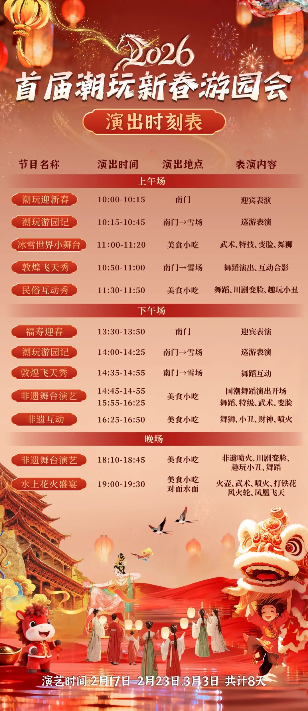 融合国潮文化与自然景观,打造沉浸式文旅体验——天灯放飞祈福:让美好心愿随星光升空,定格团圆时刻的浪漫与温馨。非遗打铁花:滚烫铁水凌空泼洒,瞬间化作万千星火,如星河倾泻、火树银花绽放。 鱼灯巡游:红彤彤的鱼灯点亮园区,步步皆景,氛围感拉满。逍遥·百戏:舞狮献瑞、街头杂耍轮番上演;全员大舞台《龙腾虎跃·新春大联欢》邀你一起载歌载舞,沉浸式感受元宵喜乐氛围。