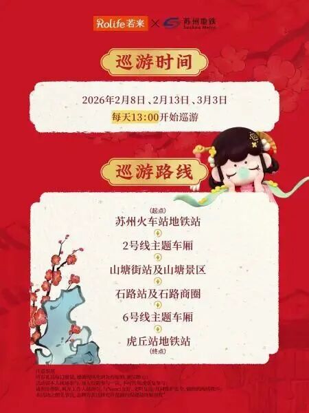 元宵节当天,苏州地铁联合Rolife若来Nanci将穿行在苏州地铁线上,把福气送到经过的每一个站台、每一节车厢。
