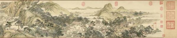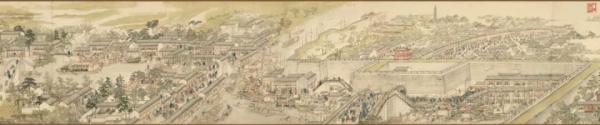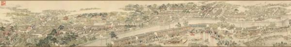 清代画家徐扬绘就的《姑苏繁华图》自苏州西南灵岩山起,经木渎镇、横山、石湖、苏州郡城,出阊门、沿山塘街,终至虎丘山,完整呈现了“一村一镇一城一街” 的百里水乡景观,现藏于辽宁省博物馆。