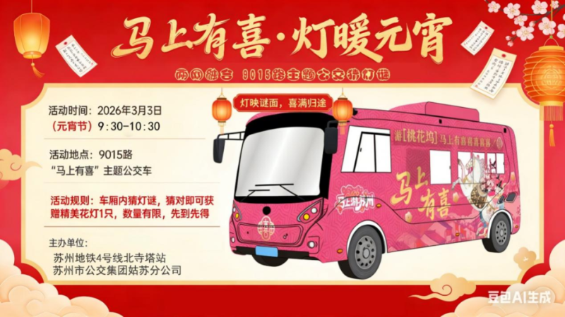 红彤彤的灯笼挂满车厢、趣味灯谜卡片随处可见、手工DIY花灯免费送……3月3日(元宵节)9:30-10:30,9015路“马上有喜”主题公交邀你闹元宵!