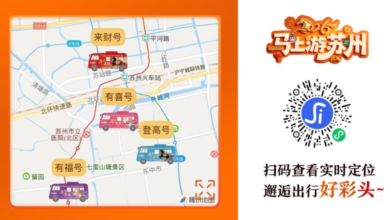 活动期间,打开“苏智出行”微信小程序,进入2026马上游苏州专属页面。你可以实时看到好运巴士在城市中穿行的身影,锁定它们的位置与动态,提前规划你的行程,高效“邂逅”主题公交。