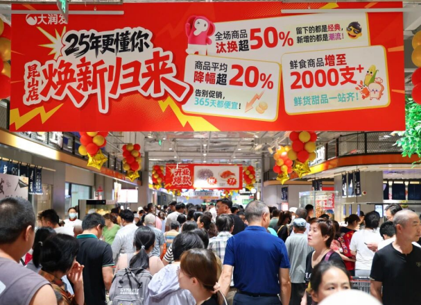 大润发以一场覆盖全国的门店调改,在2025年完成了对过往发展逻辑的系统性升级,其中最有代表性的是9月焕新开业的昆山店。这家曾蝉联全国销售冠军的门店,焕新开业单日销售额突破575万元,交易客数三万余人,刷新品牌历史纪录。