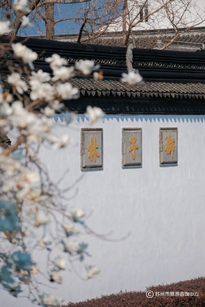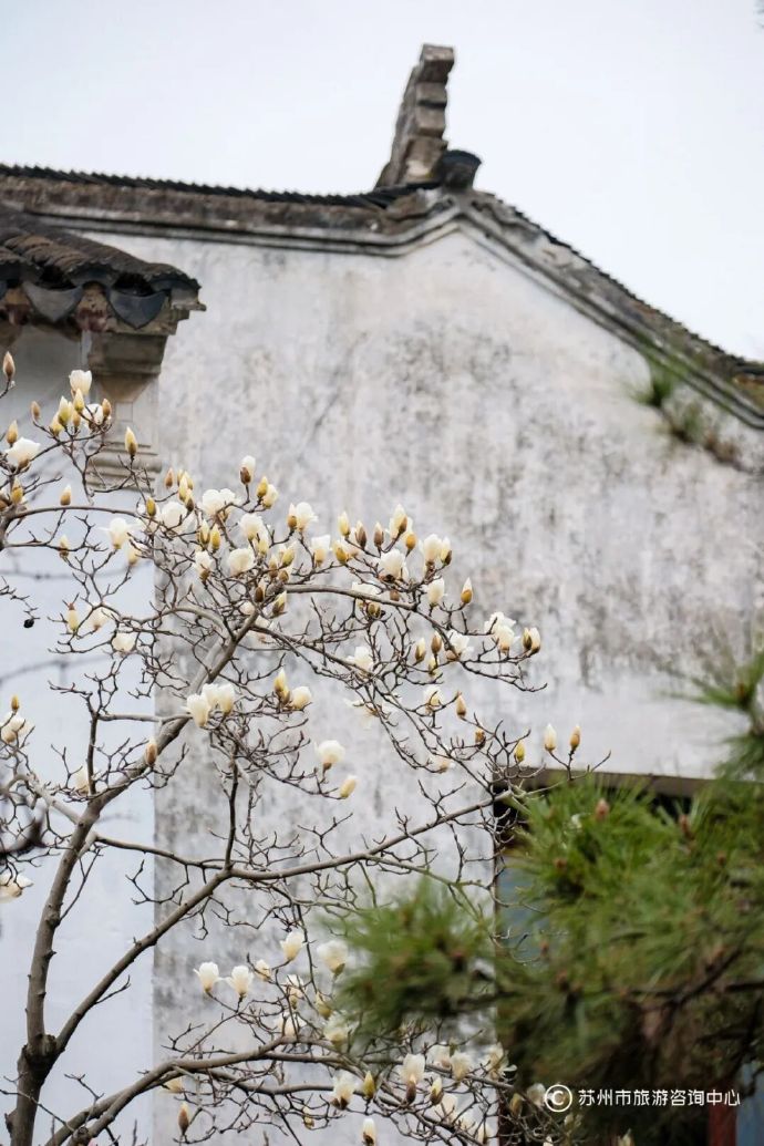 狮子林外停车场,白玉兰伫立在风中,摇曳着疏枝清影,映衬着粉墙黛瓦,从岁月深处传来幽远清雅的味道。