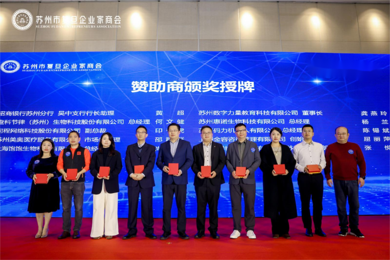 活动最后, 苏州市复旦企业家 商会 副会长陈宏庆先生为赞助商颁奖举行授牌仪式。为 招商银行苏州分行、 盘科节律(苏州)生物科技 股份有限公司 、 同程网络科技股份有限公司 、 苏州美奥口腔医疗服务有限公司 、苏州惠诺生物科技有限公司、苏州码力机器人有限公司 、上海金容合咨询管理有限公司 赞助企业 举行授牌,感谢各企业对 苏州市复旦企业家商会 2026年新春团拜会 的鼎力支持。