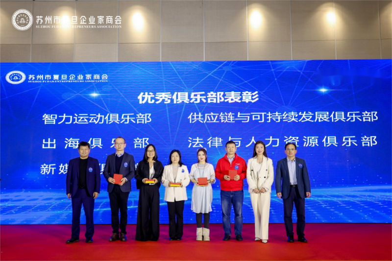 活动现场, 苏州市复旦企业家商会执行会长胡明晶女士、副会长兼党支部书记韩兴成先生、副会长何文健先生为 苏州市复旦企业家 商会优秀俱乐部 :智力运动俱乐部、供应链与可持续发展俱乐部、出海俱乐部、法律与人力资源俱乐部 、新媒体俱乐部进行表彰 。