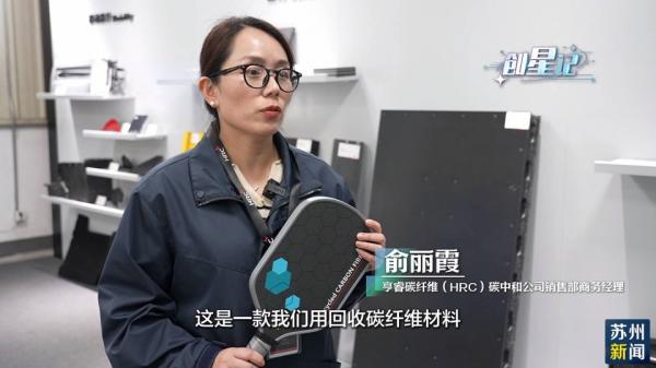 亨睿碳纤维(HRC)集团销售部经理俞丽霞介绍:“这是一款我们用回收碳纤维材料制成的匹克球拍,它在维持轻量化的同时,保留了原生碳纤维的力学性能。”